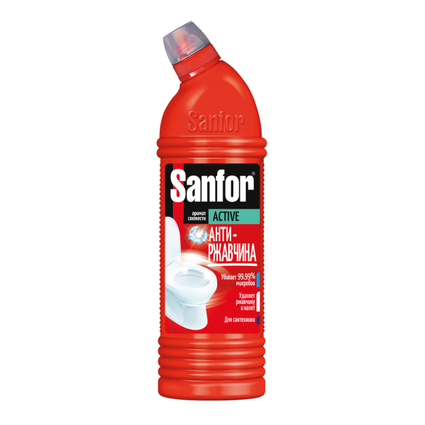 Чистящее средство для туалета гель Sanfor WC gel "Active Антиржавчина" за одну минуту удаляет ржавчину с поверхности унитазов. Мощная формула геля так же быстро устраняет известковый налет, мочевой камень и другие сложные загрязнения. Препятствует появлению новых отложениий на поверхности унитаза. Убивает микробы и устраняет неприятные запахи. Благодаря загущенной формуле равномерно распределяется по поверхности, экономично расходуется. Флакон оснащен антискользящей поверхностью, его удобно удерживать в руке во время уборки, а также блокиратором крышки для защиты от детей. Результат регулярного применения Sanfor WC Gel Аctive – чистота и свежесть ванной комнаты!