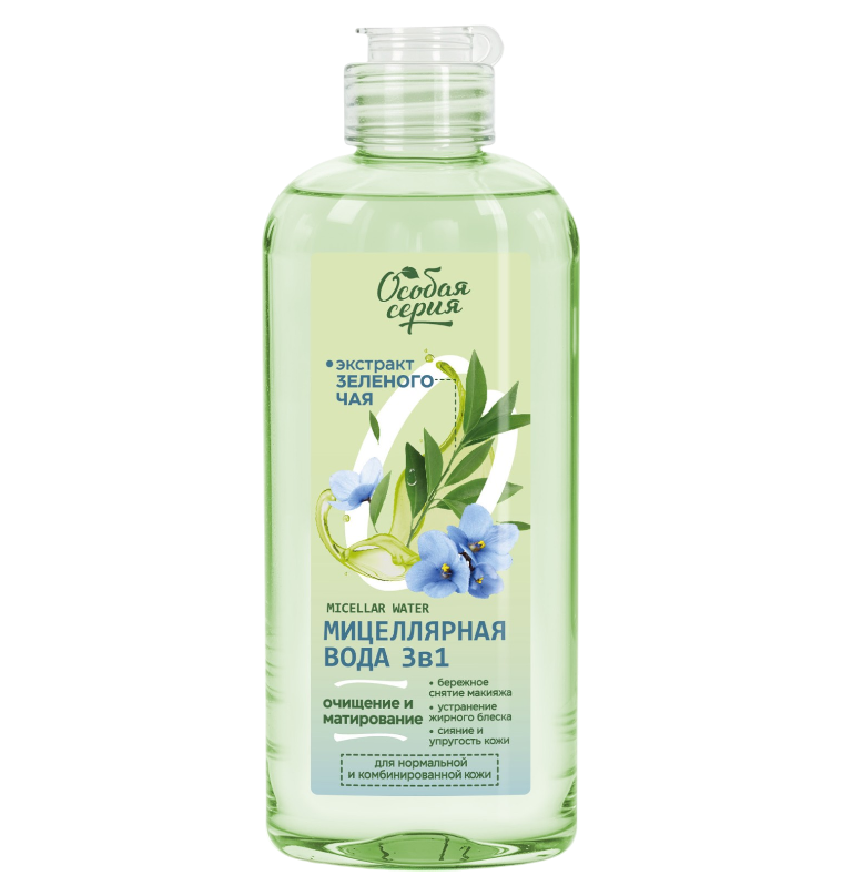Мицеллярная вода 3 в 1 с бодрящим тонким ароматом зелёного чая эффективно очищает и освежает кожу, удаляет макияж, загрязнения, устраняет жирный блеск.